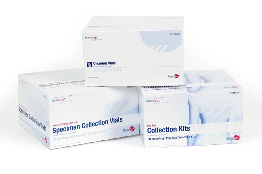 The brand identity we created for Monogen, a medical equipment company, represents the circle area of a specimen glass slide and the stacking of slides in an automated processing tray. The rollout of MonoGen's flagship product, the MonoPrep LBP liquid-based automated specimen processor, required a coordinated, highly organized marketing materials and packaging system for the related consumable products.