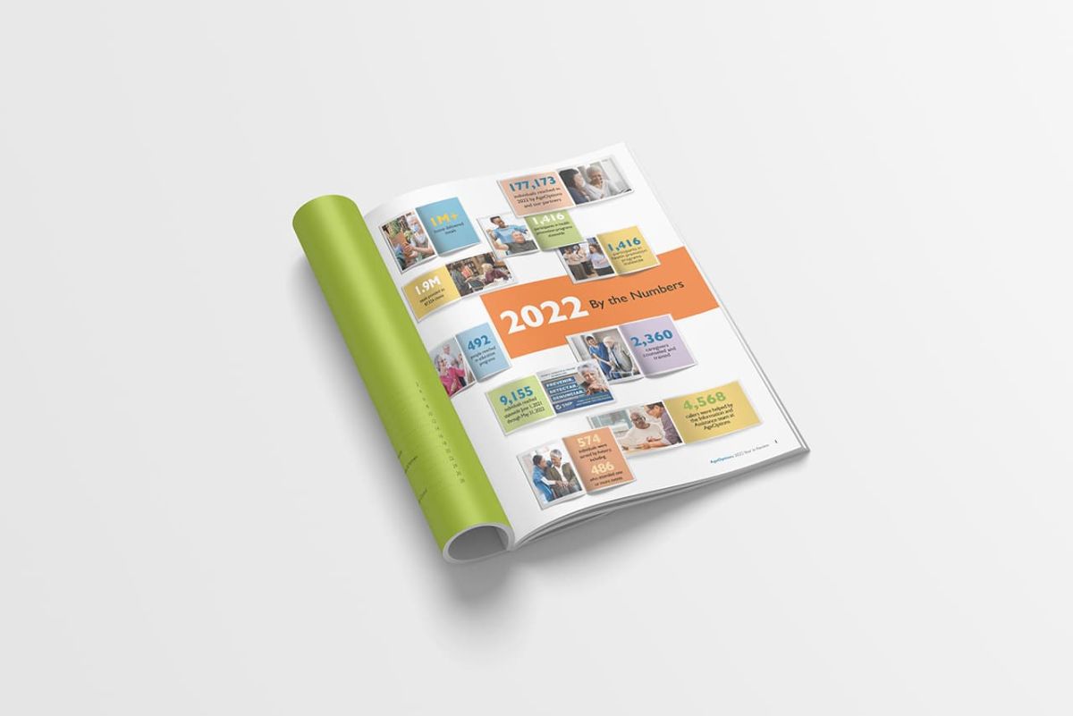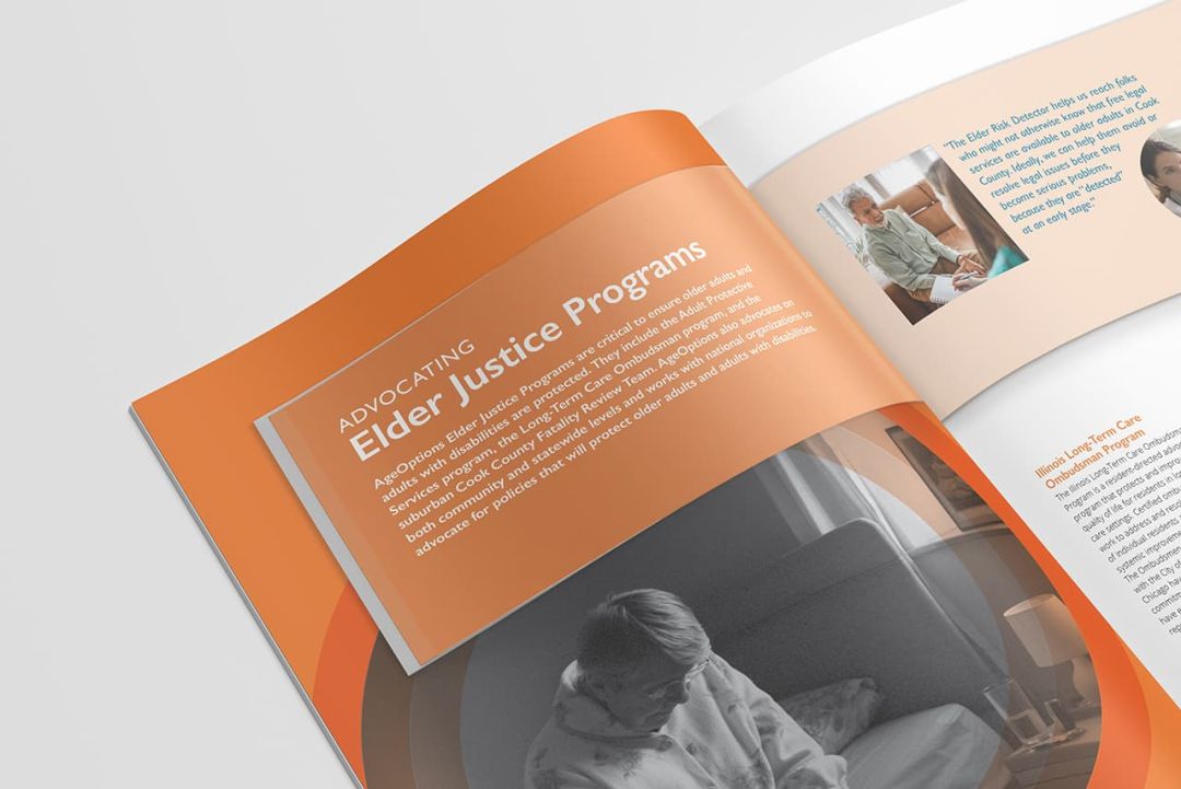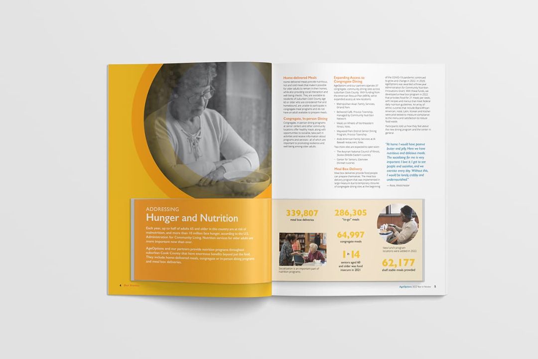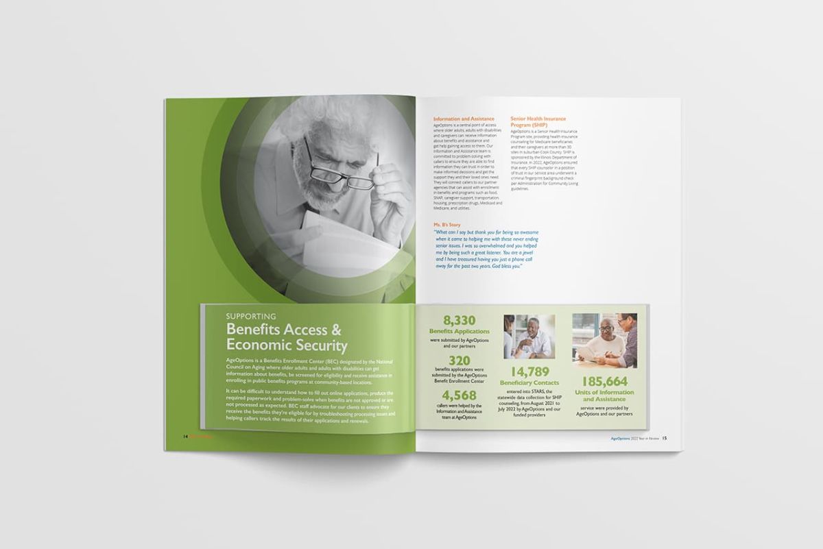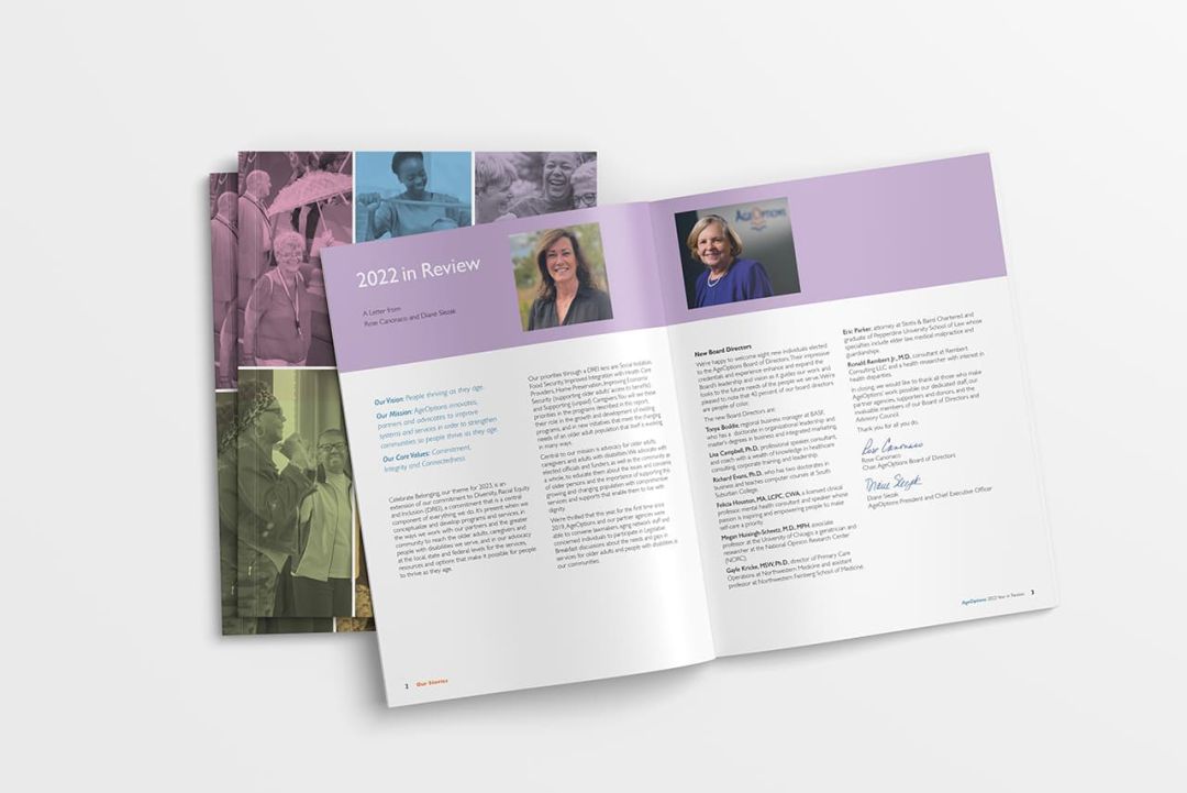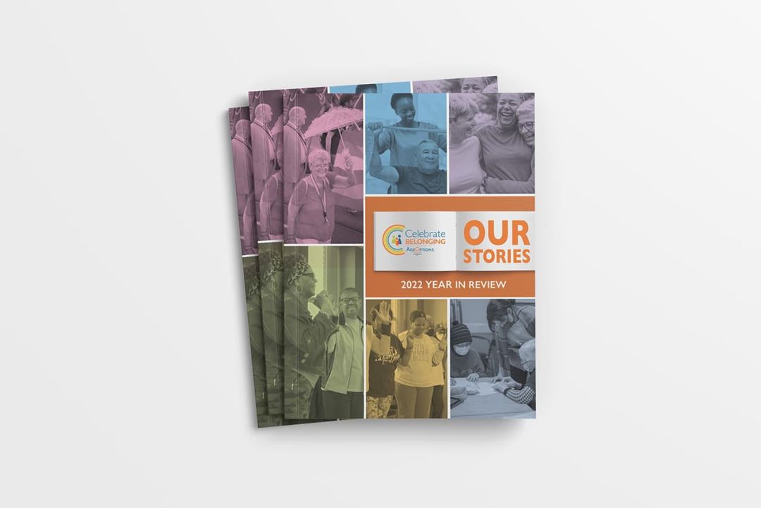 The concept takes a storybook approach to focus on the impact of the AgeOptions programs on the community. The black and white photos dramatize the population’s real challenges. They are juxtaposed with bright, colorful pictures of AgeOptions programs and solutions. Communicating these positive outcomes is encapsulated as “Our Stories” and is used with a dimensional book image for effect.