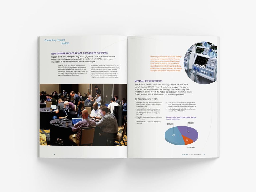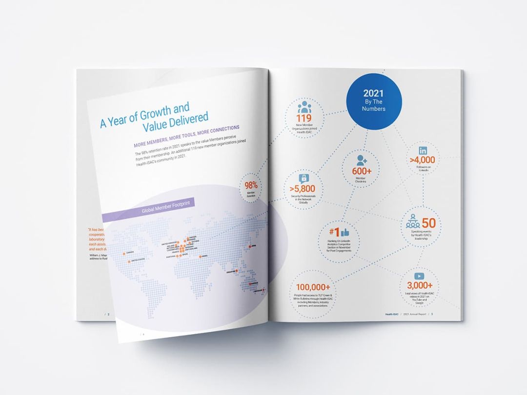 NeigerDesign collaborated with Health-ISAC to publish its first Annual report, highlighting a successful 2021 for Health-ISAC and its Sharing Community. The 2021 theme of Connecting for Patient Safety and Healthcare Ecosystem Resilience illustrates how Health-ISAC connected Members to information, tools, services, white papers, webinars, education, collaboration, networking, exercises, summits, and working group efforts to ensure Member healthcare organizations around the world could prevent, detect, and respond to physical and cyber threats. Health-ISAC’s Threat Operations Center (TOC) disseminated nearly a thousand Vulnerability and Incident Reports, and we created an engaging timeline centers to visually depict the most prevalent incidents and vulnerabilities for the year.